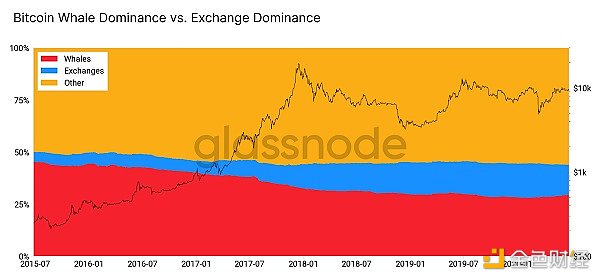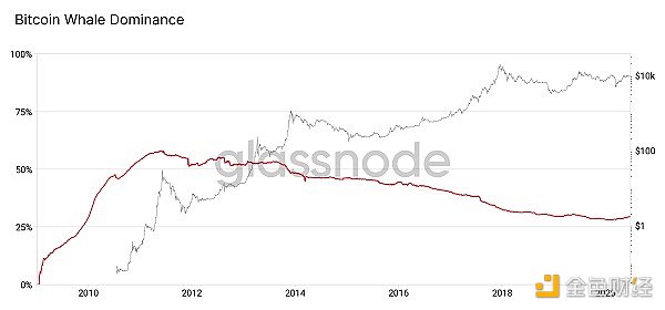 回顧比特幣的整個歷史會發現,巨鯨持有的BTC余額在2016年初時達到頂峰,之后就開始持續下降,但他們的市場主導地位其實從2011年初就已經成型并達到峰值了。因為早些年比特幣的總供應量比較低,因此那時候巨鯨在市場中的確可以占據主導地位(即比特幣巨鯨所持有的BTC的比例會非常高),而這樣的市場主導地位也持續了一段時間。盡管近期比特幣巨鯨的市場統治地位在下降,但是這種變化似乎并沒有對比特幣價格形成影響,尤其是在最近十年時間里,比特幣價格一直保持著持續增長態勢。