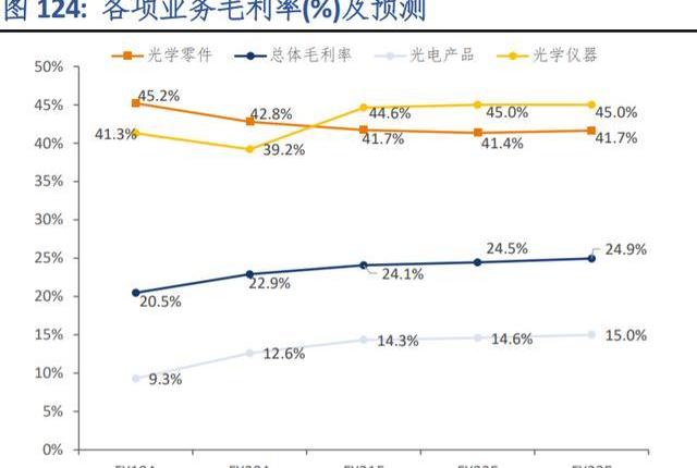 光電產品為主要收入來源,光學零件為利潤最大貢獻。光電產品(手機攝像頭模組、車載鏡頭模組、VR/AR模組等)具有較高價值量,為公司主要收入來源。板塊收入占比于2013年后保持在75%以上,2020年光電產品、光學零件及光學儀器收入占比分別為75.0%、24.2%及0.9%。光學零件憑借高技術壁壘擁有較高毛利率。公司光學零件板塊毛利率于2016年后保持在40%-45%,高于光電產品約10%的毛利率水平,為公司利潤最大貢獻。2020年受新冠疫情影響,光學零件毛利率同比下降2.4個百分點至42.8%。