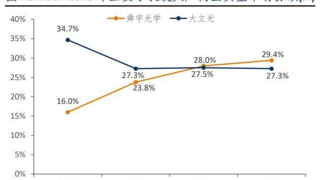 鏡頭產業高技術壁壘推動行業集中度提升。手機鏡頭具有較高的技術和工藝壁壘,包括專利技術、生產工藝、模具制作以及客戶定制化需求等方面。高技術壁壘推動行業集中度提升,主要體現為頭部廠商利用先發優勢進入主流手機品牌供應鏈,后期手機攝像頭規格升級倒逼頭部廠商進行技術革新。技術創新差距的拉大擠壓中小廠商生存空間。根據我們估算,2020年頭部廠商舜宇光學和大立光以出貨量口徑統計市場份額分別約為29.4%以及27.3%,合計市場份額較2017年提升6.0個百分點。
