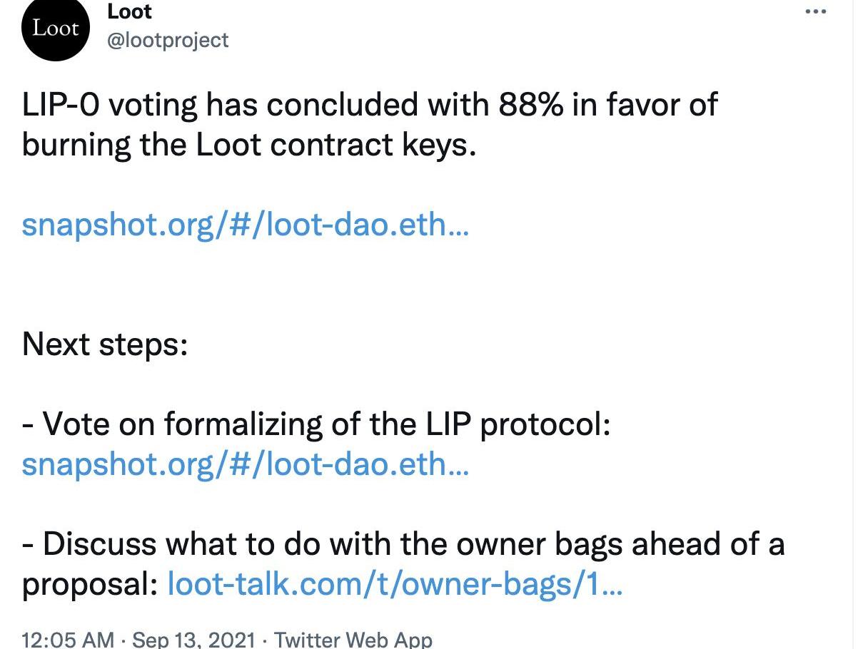 XRP/HKD-0.91%巴比特訊,Loot社區以88%的支持率投票通過LIP-0提案,支持銷毀Loot合約密鑰。銷毀秘鑰是當前合約所有者的手動操作,并將在社區對所有者包的投票結束后發生。因此下一步將對LIP協議的正式化進行投票,在提案之前討論如何處理所有者的包。