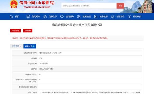 2022年4月22日,嶗山區市場監督管理局對青島宏程都市果嶺房地產開發有限公司作出了罰款人民幣七千元整的處罰決定。