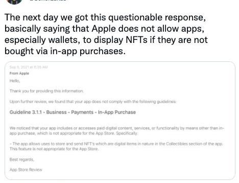在試圖解決問題的后續消息中,AppleAppStore回應稱,Gnosis應該刪除該功能。一位AppStore審核員寫道,“如果不是通過應用內購買的方式購買的,蘋果不允許應用程序,尤其是錢包顯示NFT。”