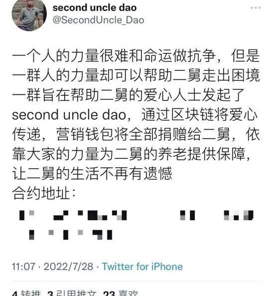 但從一開始,‘seconduncledao’就未公開任何與二舅或者‘衣戈猜想’建立過聯系的憑證,也許是項目方不能露面的考慮,或者這是一場低調到想給二舅一個驚喜的募捐活動,但最后募到的錢如何給到二舅手里,這成了一個疑問。