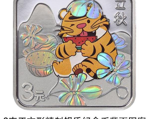 8克正方形銀質紀念幣背面圖案以虎、西瓜、瓜秧為主要設計元素,展現立秋時節吃瓜“咬秋”習俗,并刊“立秋”字樣及面額。