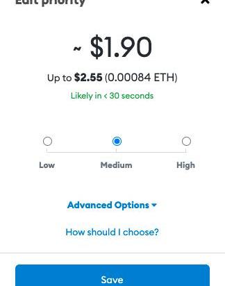 默認情況下,MetaMask的10.0.0版本會自動設置交易的最高優先費用。您可以用"編輯"按鈕修改這些費用,可以選擇低、中或高費用。