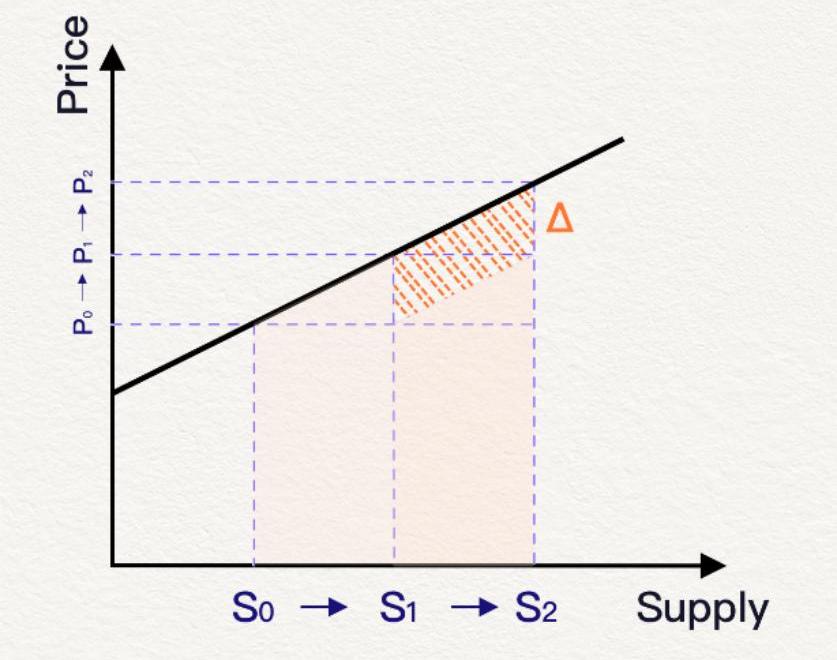 當價格的上漲推動新的供應被鑄造時,Δ代表與之前鑄造的相同數量的供應相比,實際鑄造所需的額外資本。當代幣供應量變大時,Δ將越來越大,需要更多的資金來接納更大的曲線市值。