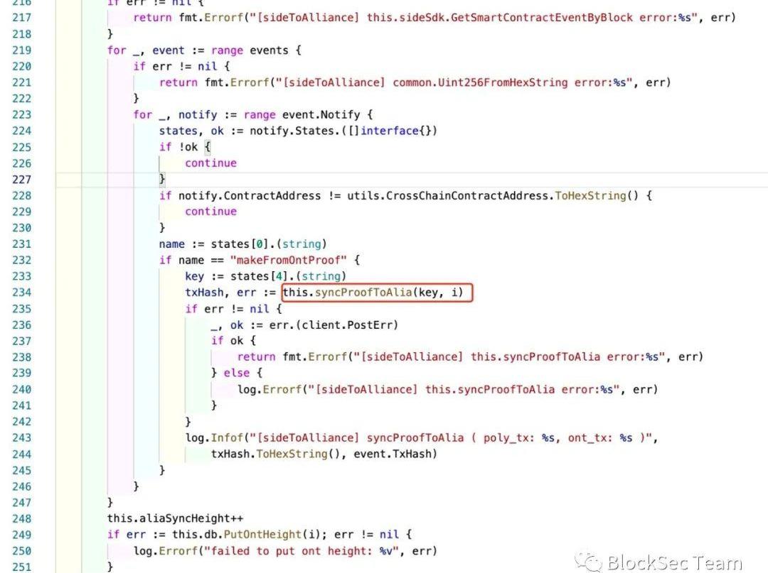 在上圖中,OntologyRelayer調用Ontology鏈提供的RPC接口(第215行,調用SDK函數GetSmartContractEventByBlock)獲取區塊中觸發的智能合約事件;然后在第228和232行表明OntologyRelayer只監聽OntologyChain上由CrossChainContractAddress觸發的makeFromOntProof事件;