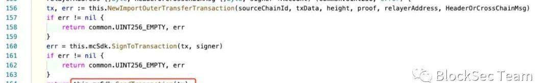 上圖中,在處理OntologyChain上的跨鏈交易時,OntologyRelayer總共做了五次校驗,分別是兩次向OntologyChain發送的RPC請求校驗(check1和check4),以及三次參數是否為空的校驗(check2,check3,和check5)。這五次校驗都屬于常規校驗,并未對來自OntologyChain上的跨鏈交易做語義上的校驗;第167和171行取出了在目標鏈上執行所需要的交易參數信息;第183行向PolyChain發送交易;