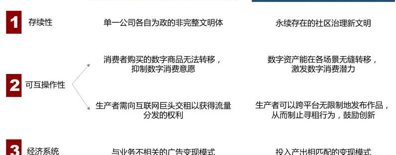 資料來源:MatthewBall,ICBCInternational元宇宙的靈魂在于以現實世界的高度仿真,克服人類對“存在”的恐懼。通過上述分析,我們不難發現,元宇宙概念本身并非開拓性的創新,它只是以縫合的方式集成了現有及未來先進科技之精粹。雖然元宇宙是一頭縫合怪,但我們認為,它并非行尸走肉。人類科技的進步最終總是被“恐懼”驅動:比特幣的出現是基于對貨幣霸權的恐懼,區塊鏈是基于對欺詐的恐懼,元宇宙所應對的則是人類對存在的恐懼。柏拉圖提出的哲學命題“我是誰?我來自哪里?我要到哪里去?”,便是人類對自身存在感最深層恐懼的體現。元宇宙的理想形態是永續存在的無延遲虛擬宇宙,人們通過在虛擬經濟體中塑造自己的數字化身,以期克服對于生命起源、出身背景乃至最終死亡的恐懼。未來人類在元宇宙中訓練AI,以自身再造探索生命如何起源;人類在元宇宙中重新設定自己的外貌和出生環境等先天條件,以公平起點參與虛擬經濟體的活動;甚至人類或許能在腦機接口技術的不斷催熟下實現大腦意識的永生,從而擺脫生理死亡。由此我們便可以點明元宇宙與現階段移動互聯網的顯著區別。移動互聯網的參與方式存在諸多不自然的地方,更類似于一個現實世界虛擬化的半成品,而元宇宙是現實世界的高度數字仿真,未來或許還將反過來指導現實世界的發展路徑。元宇宙的靈魂具體表現為以下三個特性。第一,永續性。個體公司會倒閉或消失,假設微信突然停止提供服務,我們在其中的好友關系和聊天記錄均會隨之永久消失。但元宇宙是一種永續存在的新文明,甚至超越現實物理世界的存在跨度。基于開源社區特性,元宇宙中的任何內容、應用和資產都可以轉移,以另一種呈現方式延續。第二,高度可互操作性。從消費端來看,物理世界內實物商品的使用往往不受場景限制,假如人們在迪斯尼樂園中購買的周邊商品僅限于在園內使用,將會大幅降低商品的購買意愿。從本質上說,移動互聯網就類似于上述的迪斯尼情形,當前所有的數字商品都割裂地存在于格式大相徑庭的數據庫中,并且無法實現內容交互,人們在數字世界的購買意愿由此被抑制。進入元宇宙時代,數字資產將模擬現實世界商品的特性,支持無縫從一個地點遷移至另一個地點,以此開發數字消費的潛力。從生產端來看,現實世界中擁有稅收權利的主體是政府,稅收用途主要集中于公共領域建設、維護社會穩定和縮小貧富差距等,但移動互聯網時代的科技公司各自為政建立閉環生態圈,以網絡效應鎖定流量與收割利益,成為制定規則的收租者。元宇宙以開源共享制止尋租行為,支持跨平臺操作讓數字生產者獲取應得收益,從而激發生產端的創新與活力。第三,完整經濟系統。在物理世界中,商品的投入與產出一一對應,貨幣則是價值傳遞的機制。但目前互聯網企業的主流變現模式仍是挖掘廣告價值,這意味著提供的數字服務無法直接收費,反而需要依靠附加的用戶數據覆蓋數字服務的成本,這種聚焦于流量變現的商業邏輯,不符合正常經濟系統投入與產出相匹配的原則。元宇宙將創造一個閉環經濟系統,任何與數據相關的微弱貢獻均可以通過區塊鏈技術溯源,配合原生數字貨幣作為激勵使整個數字世界的價值轉移過程暢通無阻。顯然,只有在投入產出相匹配的合理經濟激勵系統之下,數字經濟方能釋放出應有潛力。圖2:元宇宙vs移動互聯網