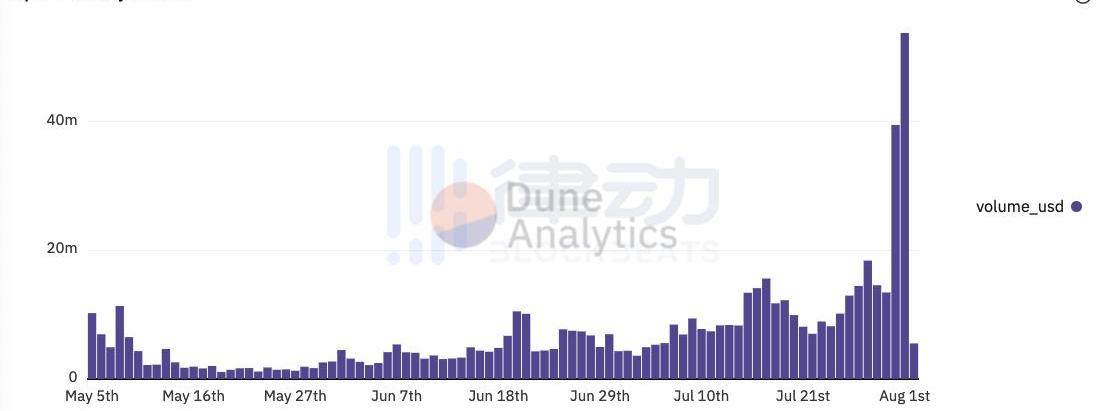 當你打開DuneAnalytics的OpenSea數據統計頁面便會發現,7月31日和8月1日兩天,這家全球最大的NFT交易平臺的單日交易額高達3946萬美元和5374萬美元,連續兩天刷新歷史最高紀錄,8月1日當天的交易額甚至幾乎達到了上個周末前歷史最高紀錄的三倍。