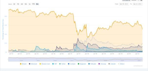 CoinMarketCap數據顯示,比特幣市值主導地位降至50%附近