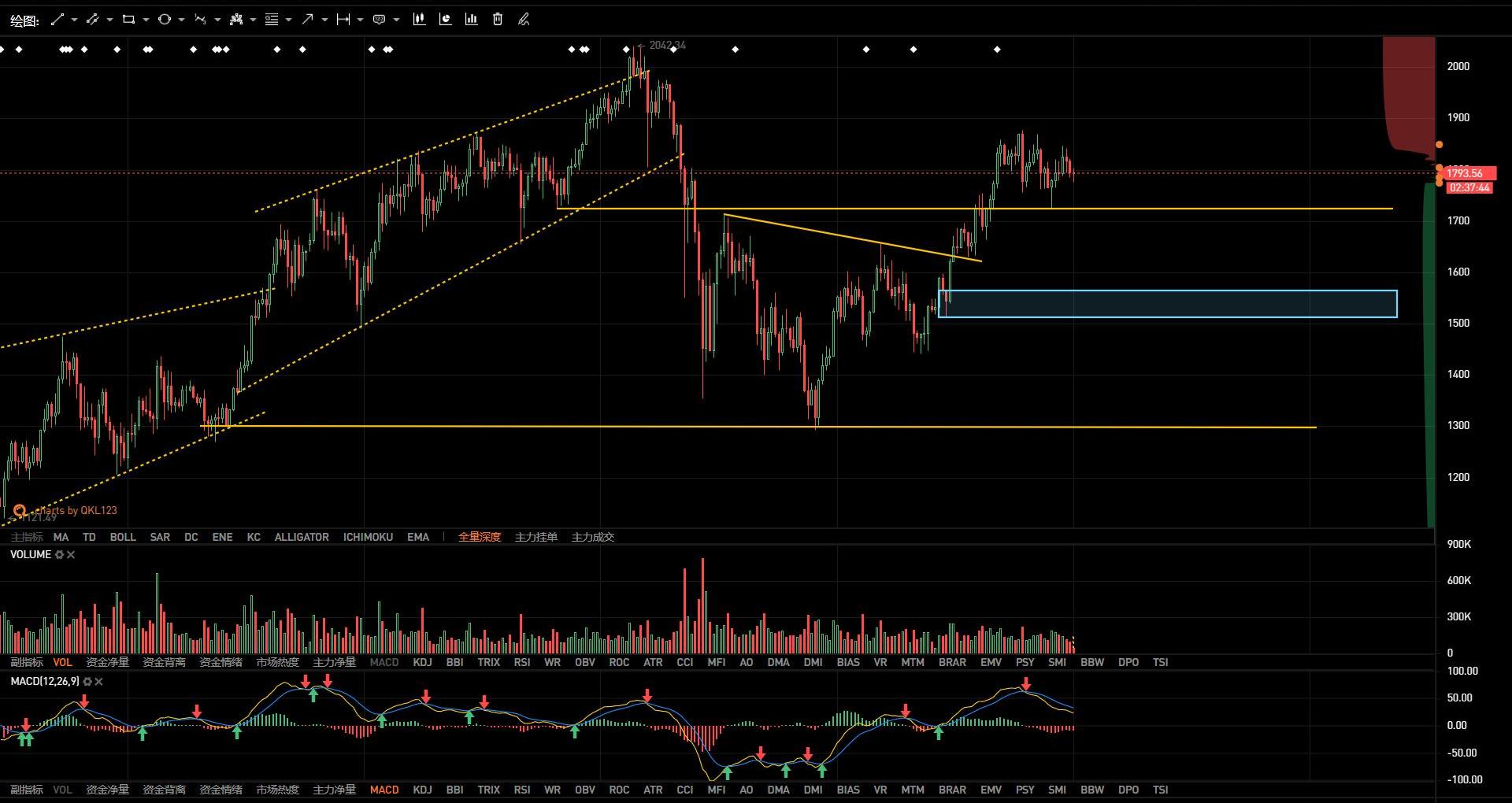 如圖所示,波卡于上方周線壓力位受阻回撤至短期需求區上沿反復震蕩,對下方潛在需求造成一定消耗,阻力效能減弱。后續關注三角下沿和短期需求區下沿所構成的死角支撐位34.8附近,若跌破則關注下方支撐32附近,反之有一定概率突破前高阻力位38.7;還需注意近一周最大解質押峰值在明天,解除質押數量達6.7022M。