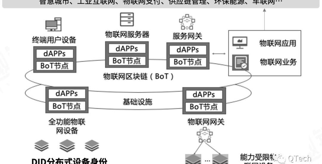 基于區塊鏈的物聯網應用架構是一種去中心化的業務平臺,它由中心化的服務模式變成了多節點分布式部署的服務模式,可以進行很好的容錯與擴展。可以支持多種分布式的服務與設備,如物聯網設備、物聯網服務器、物聯網網關、服務網關和終端用戶設備等;可以使用DID分布式數字身份對設備進行身份標識,用同一套DID協議打通設備之間的壁壘;可以將業務邏輯以智能合約的形式寫到鏈上,進行自動執行處理,模式靈活,有效促進在分布式的模式下多設備多角色多機構之間相互協作,可謂是珠聯璧合。