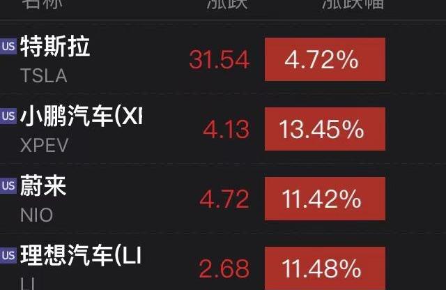 新能源車股中,特斯拉漲超4%,小鵬汽車漲超13%,理想汽車和蔚來汽車漲超11%。