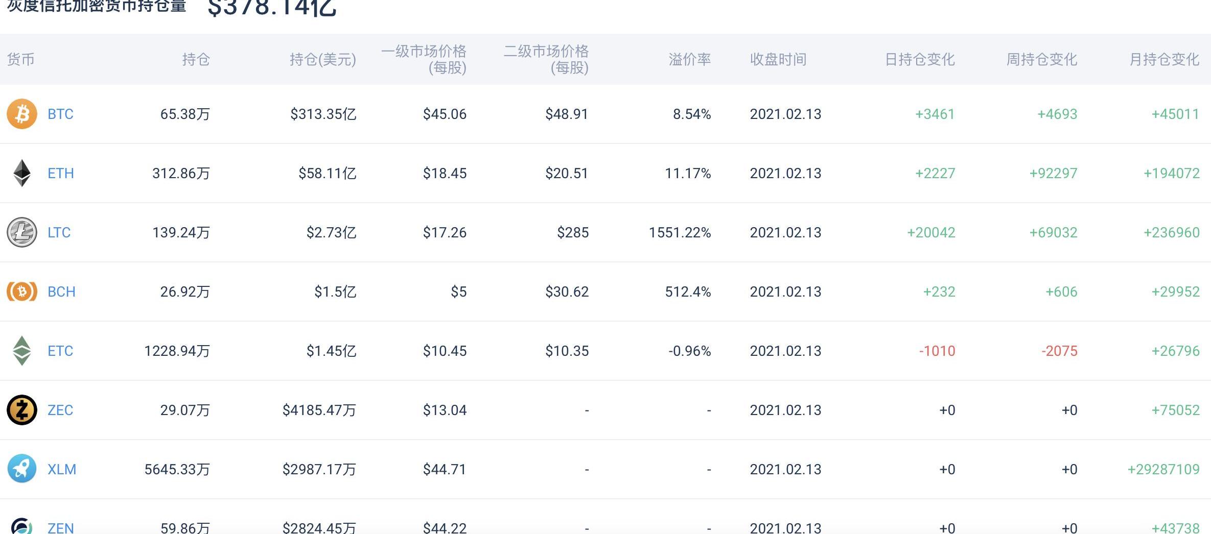 XRP/HKD-6.98%據Tokenview數據,美東時間2月12日,灰度信托持倉數據變化如下:灰度BTC信托持倉量增加3460.85枚,總持倉量為653825.42BTC,GBTC溢價率8.54%;灰度ETH信托持倉量增加2226.99枚,總持倉量為3128580.96ETH,ETHE溢價率11.17%;灰度BCH信托持倉量增加232.23枚,總持倉量為269212.58BCH,BCHG溢價率512.4%;灰度LTC信托持倉量增加20041.51枚,總持倉量為1392431.74LTC,LTCN溢價率1551.22%;灰度ETC信托當日未增持,ETCG溢價率-0.96%。