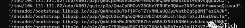 對于IPFSnode3來說,它的節點地址列表中,IPFSnode1的地址是公網地址,由于IPFSnode3和IPFSnode2都處于NAT設備后面,不能直接連接,所以IPFSnode2的地址是relay地址,IPFSnode1節點作為relay節點,IPFSnode3給IPFSnode2發消息時通過IPFSnode1轉發,relay地址格式為:
