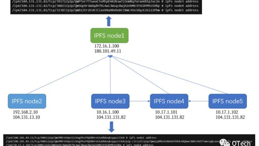 而IPFSnode3的節點地址列表中,IPFSnode4和IPFSnode5的地址均為局域網地址,這樣就完成了公網節點、處于NAT設備后的局域網節點的組網過程。
