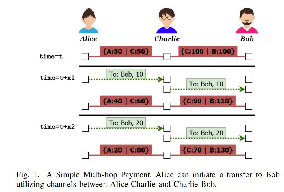 在多方之間創建的支付通道使得通過中間節點建立從源到目的地的多跳支付成為可能。如圖1所示,AliceCharlie和CharlieBob有通道。當時間為t時,A-C和C-B被初始化。雖然Alice沒有到Bob的直接通道,但是她仍然可以通過Charlie支付Bob。在時間t+x1,Alice開始向Bob轉移10個單位。這筆錢注定要留給Bob而不是Charlie。Alice在A-C頻道給了Charlie10個單位的份額,當Charlie在C-B頻道兌現這筆交易時,給了Bob10個單位。傳輸結束后,A-C和C-B通道將更新。當時間為t+x2時,Alice向Bob進行另一個事務,通道中的份額再次更新。