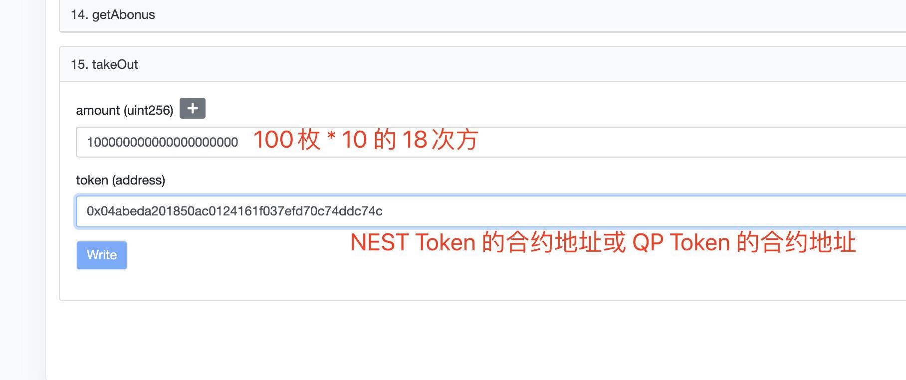2)第二欄要輸入要取出的QPToken的代幣合約,我們這里取出的是NESTToken,NESTToken代幣合約地址是:0x04abeda201850ac0124161f037efd70c74ddc74c
