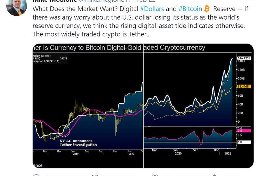 彭博社策略師MikeMcGlone發布推文稱,市場想要數字美元和比特幣成為儲備貨幣。如果有人擔心美元失去其作為世界儲備貨幣的地位,我們認為不斷上升的數字資產浪潮則會相反,交易最廣泛的加密貨幣是Tether。