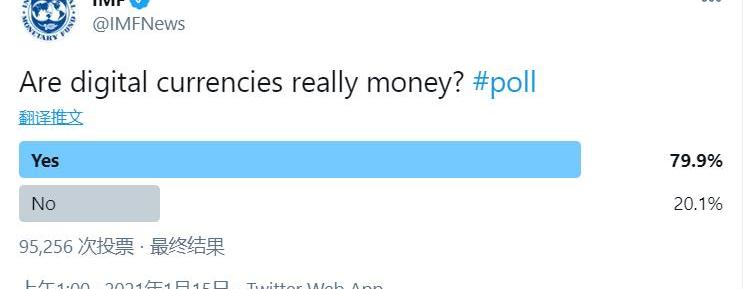 國際貨幣基金組織的官方推特賬戶最近分享了一項調查,詢問追隨者“加密貨幣”是否是“真錢”?在近100,000票中,民意調查目前領先80%左右的加密貨幣。