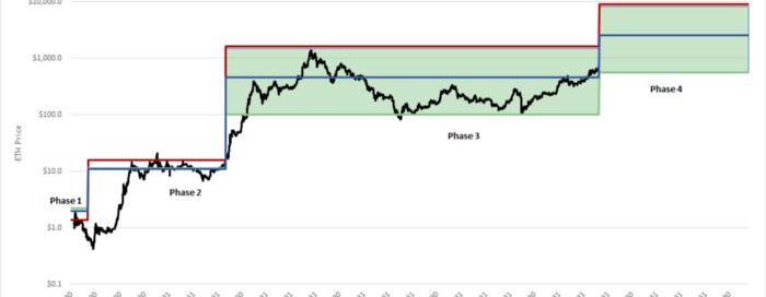 將四個階段與實際價格進行建模,產生的模型類似于PlanB的比特幣的存量到流量模型,但使用了以太坊網絡上的每日交易費用。