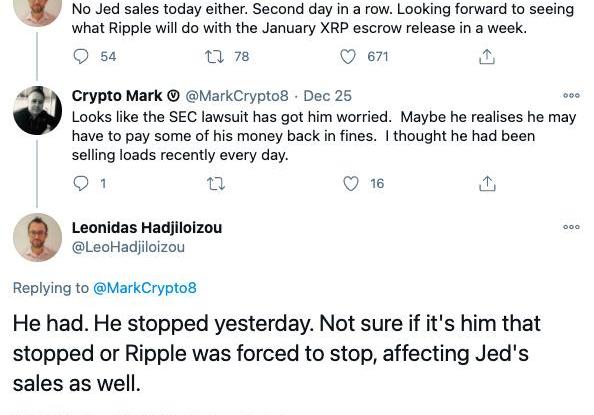 LeonidasHadjiloizou也發現了這個事情,他發推稱?JedMcCaleb已經暫停拋售XRP,不確定是他自己停了還是Ripple被迫停了而影響到McCaleb的銷售。