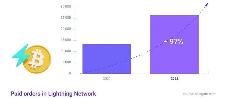2022年,CoinGate報告處理了超過25,000筆閃電支付,比上一年驚人地增長了97%。此外,在閃電網絡上進行的所有比特幣支付的比例從2021年的4.5%增加到2022年的6.3%。