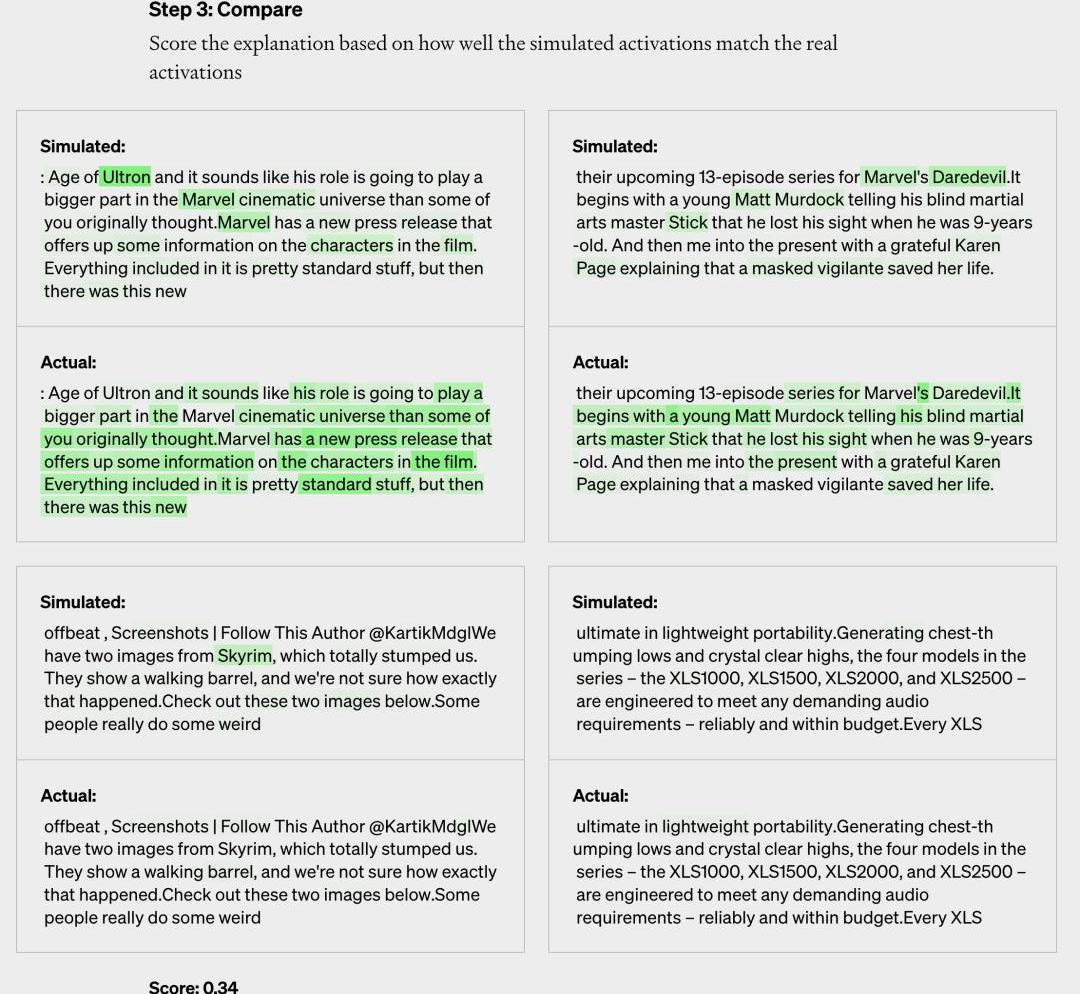 最后一步,對比評估打分。對比4代模擬神經元和2代真實神經元的結果,看GPT-4猜的有多準。