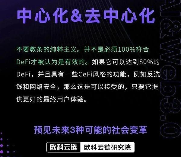 除了更多的工具出現在第二個階段外,中心化和去中心化的混合方案也是下一步我們能觀察到的趨勢。在金融系統方面,我認為Web3.0具有很大的潛力,但我不認為我們會有純的DeFi系統。我們會有更多混合解決方案,這是我們今天在研討會上討論的問題。這些方案將CeFi和DeFi混合使用,這實際上更加實用和有用。我關心的是結果,而不是教條的純潔主義。我認為,并不是必須100%符合DeFi才被認為是有效的。如果它可以達到80%的DeFi,并且具有一些CeFi風格的功能,例如反洗錢和網絡安全,那么這是可以接受的,只要它提供更好的最終用戶體驗。