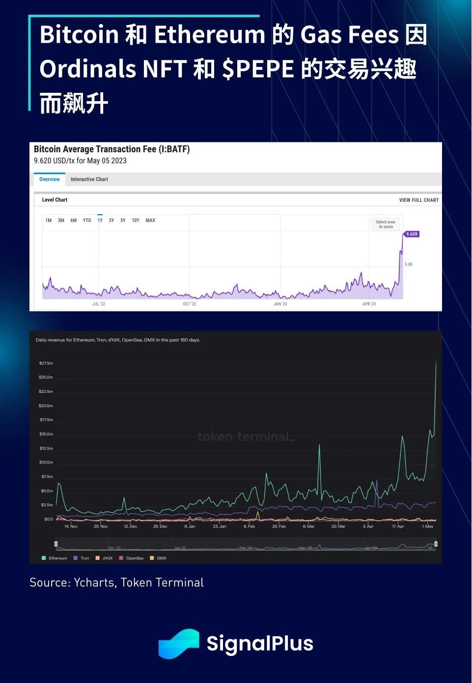 最后在加密貨幣方面,過去幾周價格沒有太大的變化,BTC和ETH分別停滯在28-30?k和1.8-2?k美元的區間。不過在主要幣種之外,一些小幣活動出現了小幅回升,其中Ordinals的活躍和最新的memecoin使得Bitcoin和Ethereum鏈上gasfee收入都大幅增加。