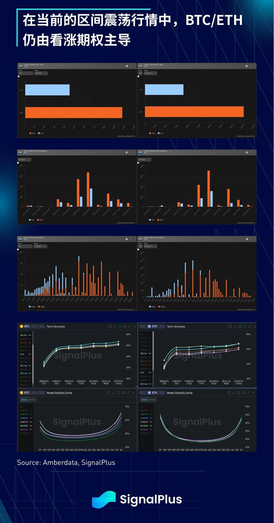 在波動率方面,由于幣價無法突破,且月底前到期的合約量都偏低,整體隱含波動率和期限結構仍然保持低迷;然而,看漲期權的未平倉量仍顯著超過看跌期權,因為交易員要不是尋求上行的風險敞口,就是在持有現貨下進行備兌看漲期權交易。我們預計本周的價格走勢將顯著受到CPI的影響,特別是如果通脹數據超出預期,美債收益率是否能有所突破。
