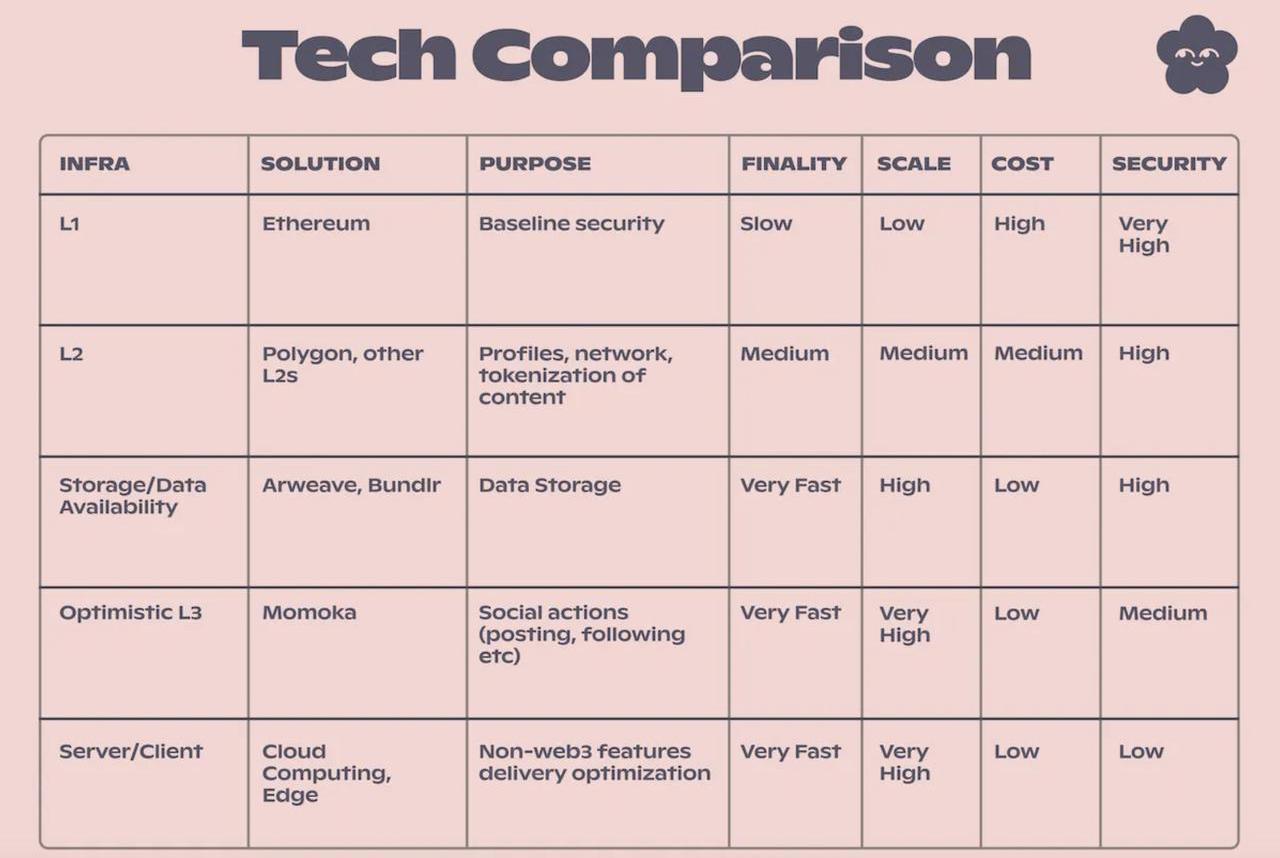 4月27日,Web3社交圖譜協議LensProtocol推出OptimisticL3擴展解決方案Momoka內測版,已可供Lens開發者使用。Momoka要解決的依然是區塊鏈的存儲與擴容限制及其與Web3社交大規模采用之間的矛盾問題,該方案試圖在不犧牲用戶主權的情況下提高網絡的吞吐量并降低成本。Momoka的特點是不會將交易壓縮到L1,而是將它們發送并存儲在數據可用層上。