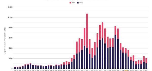 1、四月調整后鏈上總交易額下降了15.1%,跌至2070億美元,其中比特幣鏈上交易額下降14.4%,以太坊鏈上交易額下降15.2%。