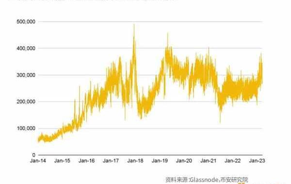 首先,讓我們更仔細地看看比特幣的每日交易數據。在從2021年牛市的高點有所緩和之后,在2022年的大部分時間里,交易活動保持在每天25萬左右。這一趨勢最近被打破,到2023年,每日交易量終于開始上升。每日交易量現在回到了300?K以上至少部分是由于序數和銘文給區塊鏈帶來的活動增加