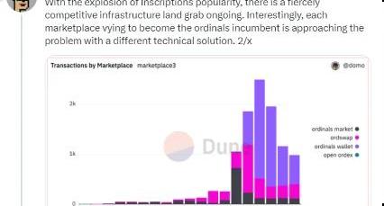 在?3?月?6?日,他關注Blur與Opensea沖突的陰影下,Ordinals?對市場的擴張,隨著?ordinals?流行度的爆炸式增長,激烈的基礎設施爭奪正在進行。其中?OrdinalsMarket以現有的以太坊基礎設施,使用?EmblemVault?開發的技術促進以太坊區塊鏈上的比特幣銘文交易,以規避比特幣網絡速度慢和體驗差的問題,其他方則采用新穎的比特幣原生解決方案。