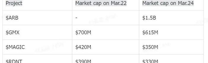 表1.Arbitrum發幣后生態市值變化