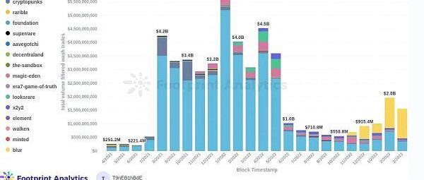 三月份的NFT市場上出現了兩個有趣的趨勢。一方面,Polygon鏈盡管在二月份有所突破,達到了NFT總交易量的4.2%,但于三月再次跌至1%以下,再次在公鏈的NFT數據表現中位列第三。另一方面,Blur的增速依然沒有放緩,反而擴大了其領先優勢,擁有NFT市場上總交易量的66%,使其成為一個顛覆性項目。在顛覆性這個形容詞被濫用的當下,Blur足以讓人眼前一亮。