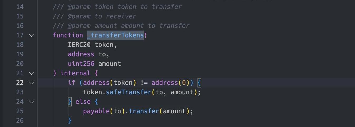 首先將傳入cook函數的data進行解碼,然后判斷amount是否等于?0?,等于?0?則將amount的值設為該合約的ERC?20代幣的余額或者ETH的余額。最后調用_transferTokens將代幣轉移到指定的地址:
