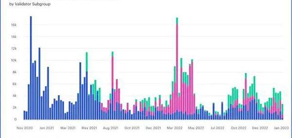 從圖2中可以看出,大約20%的新激活的驗證者仍然將他們的提款憑證設置為舊的0x00-類型。這可能是由于獨立質押者或機構使用過時的指南來激活驗證器,也可能質押者有意做出的決定,他們希望避免從部分提款中自動獲得流動資金的任何潛在稅收影響。請注意,在許多司法管轄區,質押的稅務影響還沒有明確的定義,這不是稅務建議。稅收規則因司法管轄區而異,應咨詢您所在司法管轄區的認證專業人員以獲得建議。