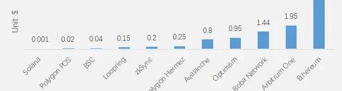 圖6.各主流Rollup和公鏈轉移原生Token的手續費。資料來源:l2fees,各區塊鏈瀏覽器,Huobi研究院整理