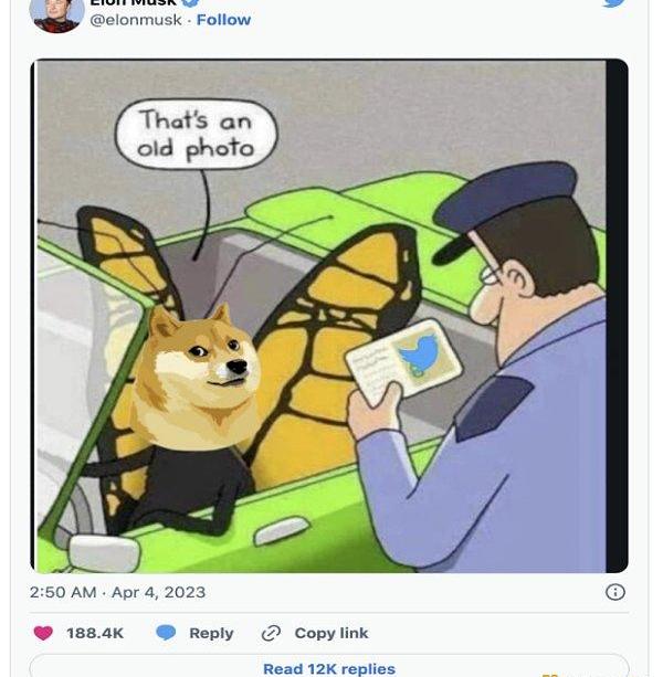 4月4日最新消息,推特網頁Logo從藍鳥變更為狗狗幣表情頭像。隨后馬斯克推特發布含有狗狗幣表情的照片。