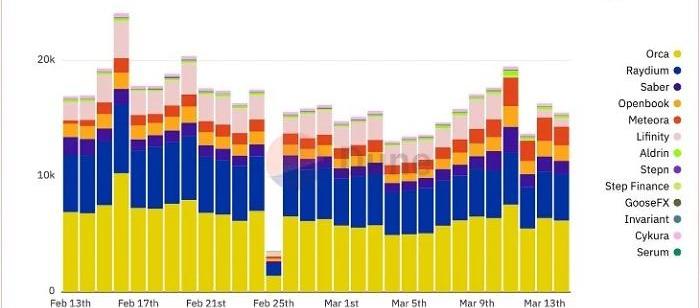 Orca已成為Solana鏈上最主要的DEX,其交易量占比已經達到74%以上,其次是OpenBook、Raydium、Lifinity和Aldrin。然而,我們仍然能在Solana鏈上看到像RootProtocol?這樣的創新項目,該項目構建了一個結合了AMM高效率和訂單簿靈活性的混合DEX。