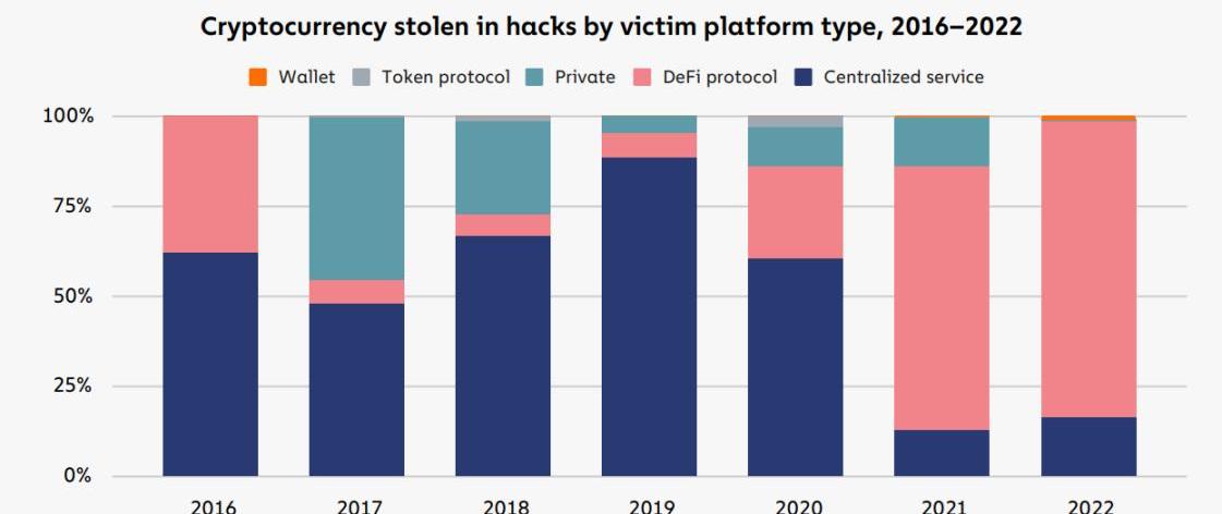 由Chainalysis發表的《2023年加密貨幣犯罪報告》估計,截止到2022年,去中心化金融(DeFi)黑客攻擊導致價值31億美元的資金被盜,而中心化服務被盜竊近7億美元。然而,這不包括FTX、Celsius和BlockFi崩潰導致的客戶損失。