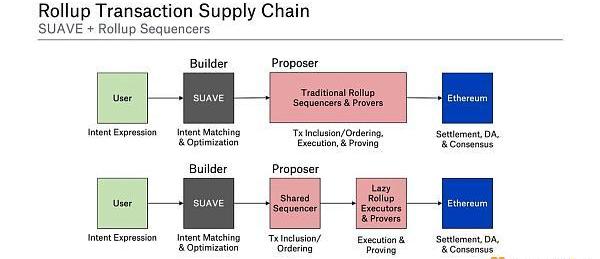 同樣,SUAVE不會取代Rollup選擇區塊的機制。例如,Rollup可以實現一個PoS共識集,其運作方式與以太坊L1的運作方式大致相同。然后,這些排序器/驗證器可以選擇SUAVE為它們生成的區塊。?