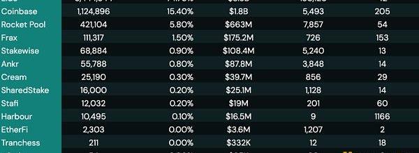 盡管Lido目前在市場占據主導位置,它還是面臨著與其他流動質押協議的嚴峻競爭,比如RocketPool、StakeWise,Frax,都慢慢地形成對Lido市場主導地位的挑戰。另外Coinbase的加入(頭部中心化交易所之一,同時也是行業巨頭)使得競爭更加激烈了。由于強大的品牌和聲譽,Coinbase在引入大量新的質押者方面處于有利地位,而且人們已經能感受到它占15.4%的流動性質押市場份額所帶來的的影響了。