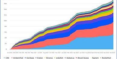 流動性質押提供商是ETH質押的最大貢獻者,占整個ETH質押市場的近32%,高于2022年初的20%。Lido是最大的流動性質押提供商,僅Lido一家就占以太坊全部ETH質押的29%以上。