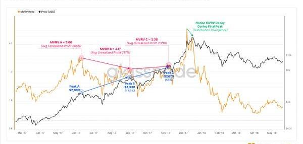 這種情況也出現在2017年后期的牛市周期中。隨著MVRV超過我們定義的極端水平2.4,我們開始看到更高的價格峰值,但MVRV比率的增長逐漸減弱。