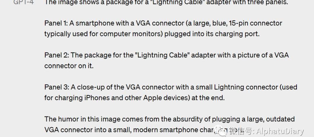 GPT-4能對相對復雜的圖像進行說明和解釋,比如說,從插入iPhone的圖片中識別出一個LightningCable適配器。