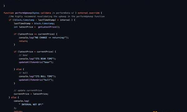 該動態NFT的運行邏輯是,根據市場上BTC/USD的交易對,來進行圖片的更新,當這一個區間的價格大于上一個區間的價格時,則會顯示牛的照片,當這個區間的價格小于上一個區間的價格時,則會顯示熊的照片,其他情況則不發生圖片的改變。
